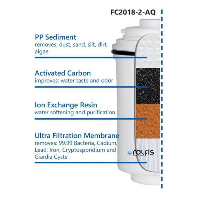 Aquafilter FH2018-2-AQ - это фильтр с угольным картриджем и ультрафильтрационной мембраной. Фильтр удаляет механические примеси, хлор, органические примеси, тяжелые металлы. Также благодаря УФ-мембране удаляет многие бактерии и вирусы из воды.