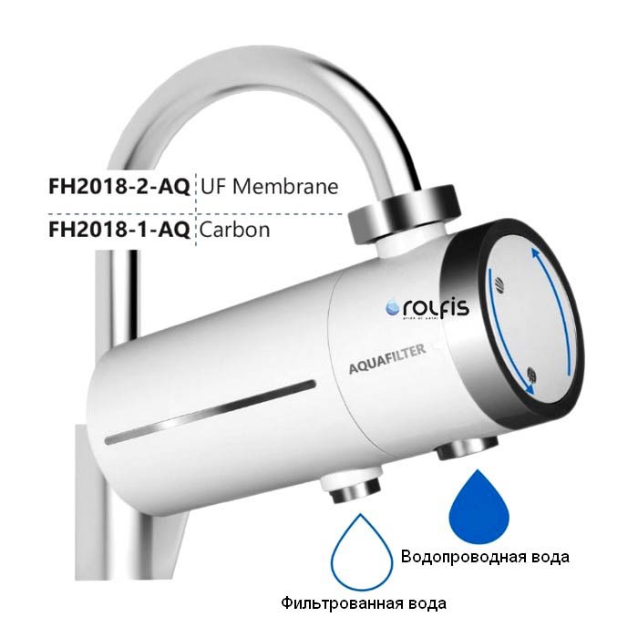 Aquafilter FH2018-2-AQ - это фильтр для воды, который устанавливается на водопроводный кран и применяется для очистки питьевой воды. В фильтре-насадке FH2018-2-AQ есть переключатель потока воды.