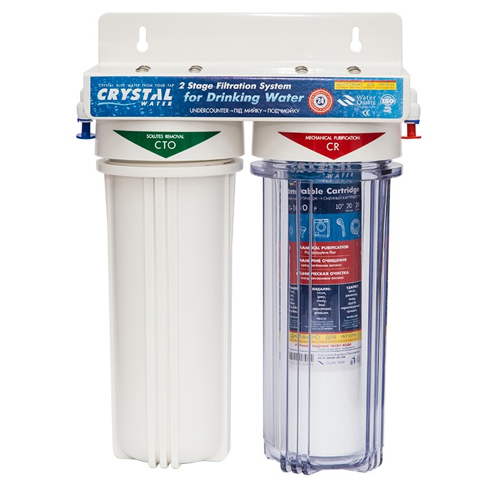 В фильтре Crystal находится один полипропиленовый и один угольный картридж. Картридж из полипропилена удаляет механические загрязнения размером более 5 мкм (ржавчина, песок и т.п.). Угольный гранулированный эффективно удаляет хлор и органические соединения, улучшает привкус и запах воды.
