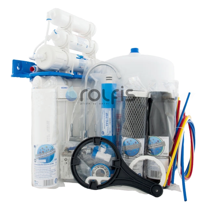 Aquafilter RX-RO6-75 - система обратного осмоса с минерализатором польского производства. Система ставится под кухонной мойкой и выводится на отдельный питьевой двойной кран. Система имеет шесть ступеней очистки воды - три картриджа предфильтрации, обратноосмотическая мембрана, постфильтр, минерализатор. Нижние колбы выполнены из качественного пластика и имеют по две уплотнительные резинки - это гарантирует надежность и долговечность системы. Мембрана обратного осмоса Aquafilter - основной элемент в системе, имеет высокое качество и изготовленная из американского материала Filmtec (считаются одни из самых качественных).