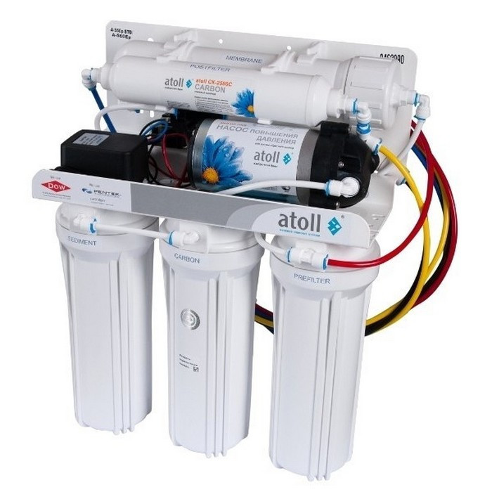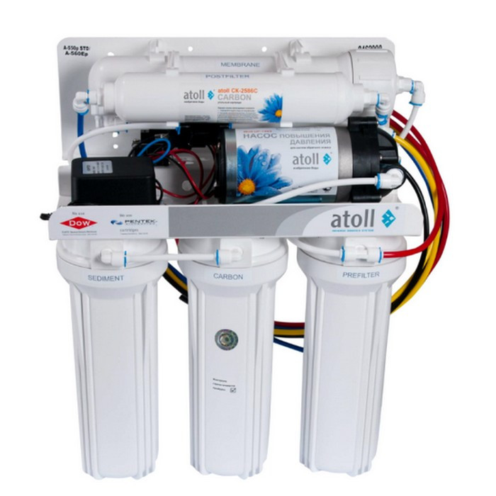 Atoll A-550р STD (A-560Eр) - система обратного осмоса высокого качества сборки и использованных материалов, фитинги John Gurst обеспечат гарантию от протекания, а износостойкие, прочные материалы позволят использовать систему в условиях украинского водопровода. Данную модель осмоса возможно использовать даже если у вас низкое давление в водопроводе.
