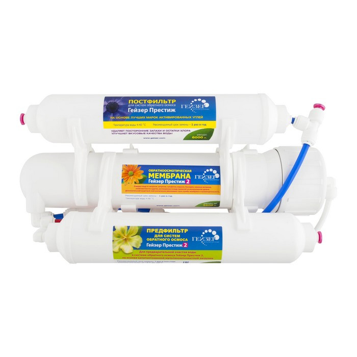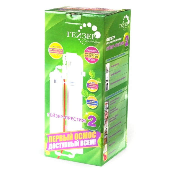 Гейезр Престиж 2 гарантированно удалит из воды химические примеси, кальций, магний, алюминий, хлориды, сульфаты, бактерии и вирусы, тяжёлые металлы и др. с минимальными затратами на эксплуатацию – замены потребуют лишь два сменных элемента: мембрана и блок предварительной фильтрации.