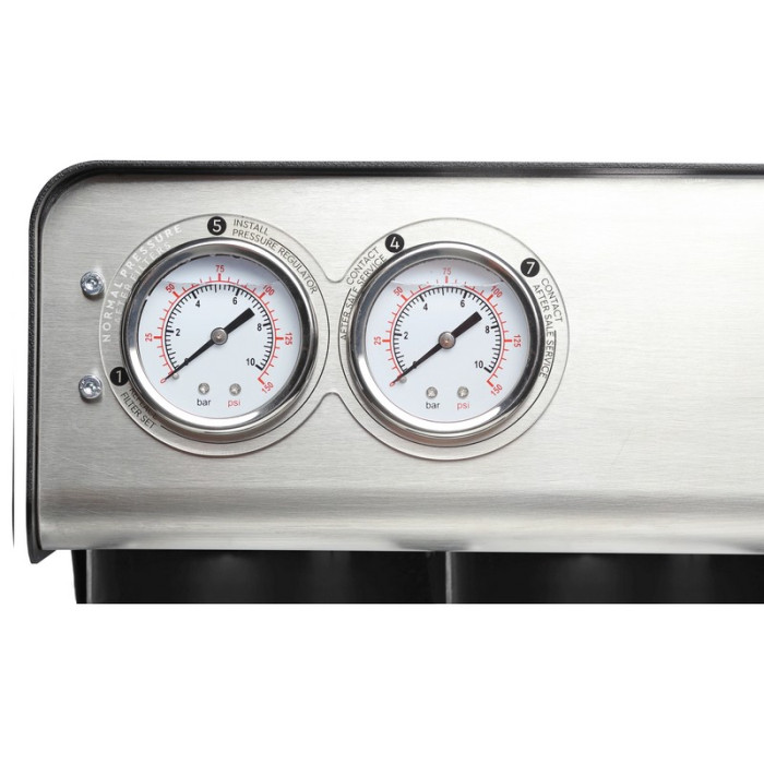 На передней панели системы RObust 1500 ECO расположены два манометра, один из которых отображает входное давление воды после картриджей предварительной очистки, а второй – давление после насоса в мембранном блоке. Насос высокого давления подаёт воду на мембрану. Мембрана обеспечивает высокоэффективную очистку воды на молекулярном уровне, удаляя из неё не только различного рода примеси, но и микробиологические загрязнения.
