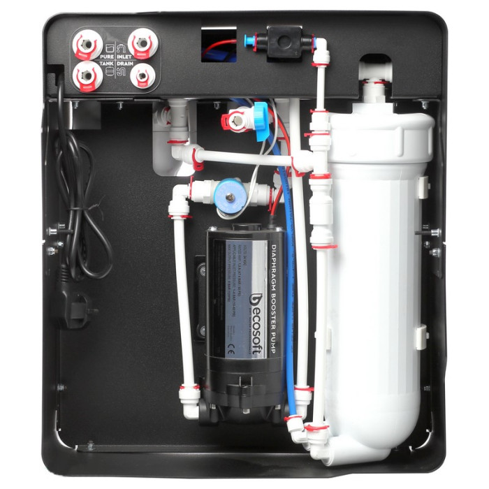 Перед угольным картриджем установлено реле высокого давления. При открывании крана очищенной воды в системе падает давление, и срабатывает реле высокого давления, открывая электромагнитный клапан и запуская насос. При закрывании крана давление в системе повышается, срабатывает реле высокого давления, клапан перекрывает магистраль исходной воды, и насос отключается. Подача исходной воды прекращается, и система переходит в режим ожидания.
