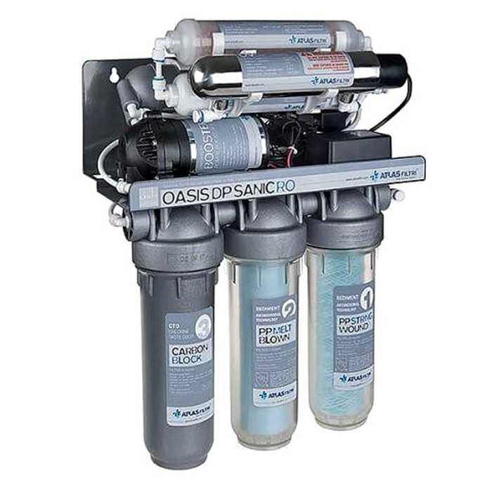 Atlas Filtri Oasis DP Sanic PUMP-UV SE6075340 - высококачественная система обратного осмоса, оснащенная противомикробной технологией. Производится в Италии. Все комплектующие и картриджи Атлас проверяются в соответствии с жесткими европейскими нормами. Фильтр устанавливается под кухонную мойку и выводится на мойку отдельный кран для питьевой воды (он входит в комплект).