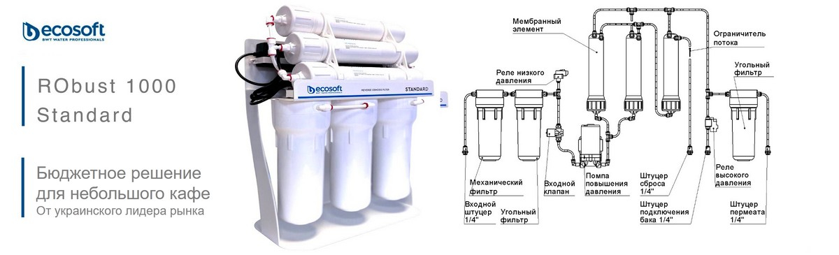 Фильтр обратного осмоса Ecosoft RObust Standard (ROBUST1000STD) - недорогое решение для очистки воды в небольшого кафе, ресторана и других точек общепита. Данный фильтр обратного осмоса отличается от конкурентов небольшими размерами и высокой производительностью - это все за разумные деньги.