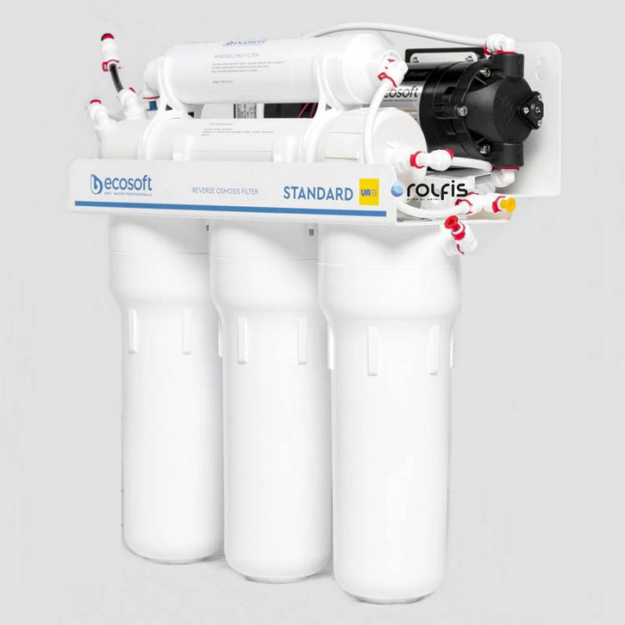 Фильтр обратного осмоса Ecosoft Standard PRO MO550MPECOSTD с помпой - это пятиступенчатая система обратного осмоса от известной украинской компании Экософт. В данной системе обратного осмоса пятой ступенью выступает - картридж минерализатор Ecosoft. После данной системы Вы получите хорошую питьевую воду, которая на 99,8% очищена от всех примесей, в том числе от бактерий и вирусов. Данная модель оснащена помпой, которая повышает давление воды. Это дает возможность использовать осмос даже при низком давлении воды (меньше 2,8 атм).