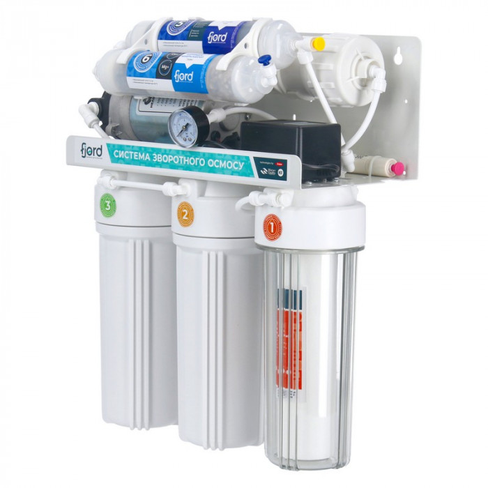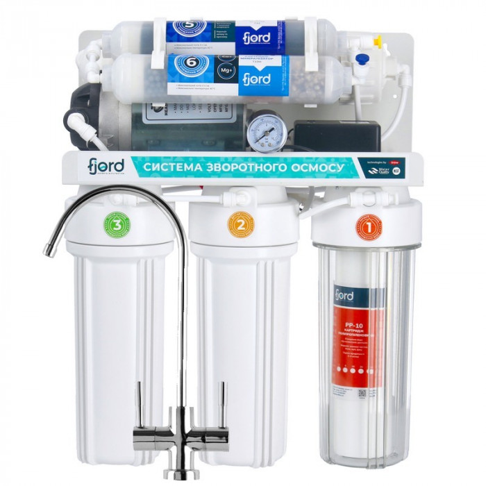 Фильтр обратного осмоса Fjord FRP 6-100 (380 л/сутки) - система фильтрации воды обратным осмосом с минерализатором и насосом для повышения давления (в случаях, когда значение давления менее 2,8 атм). Осмос с минерализатором Fjord комплектуется эффективной осмотической мембраной Fjord RO-100 GPD и вместительным накопительным баком 3,2 галлона (15л). Система предназначена для улучшения качества воды методом обратного осмоса. Удаляет из воды 95-98% всех примесей: механических, растворенных соединений и микроорганизмов. Система предназначена для установки в тумбу под мойку, дополнительный смеситель необходимо установить в раковину или в кухонную столешницу.