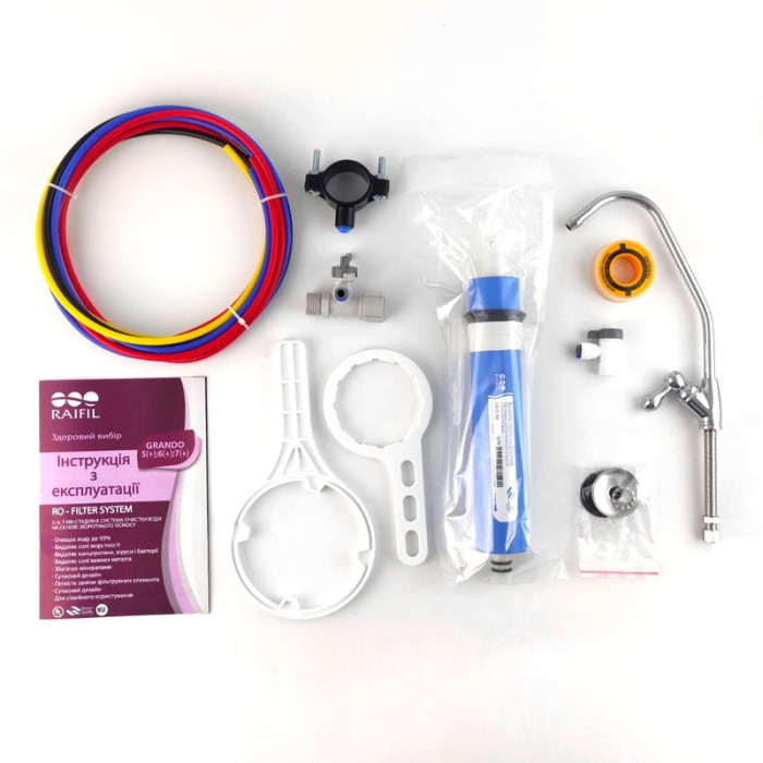 При монтаже обратноосмотической системы Raifil Grando 5 давление в водопроводных трубах не должно быть менее 2,8 bar. Это позволяет обеспечить много лет правильного функционирования фильтра.