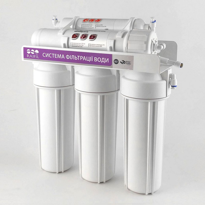 Фильтр обратного осмоса Raifil 5 Standart – система очистки воды в среднем ценовом сегменте от известного производителя фильтров для воды ТМ Raifil. В данной модели обратного осмоса за основу взят аналогичный блок-модуль, что и у более дорогой версии системы Raifil Grando 5 RO905-550-EZ, но с несколькими изменениями: первая колба непрозрачная, бак меньшего объема (9л) и одинарный кран типа стандарт. Во всех остальных характеристиках она не отличается от более дорогой версии.