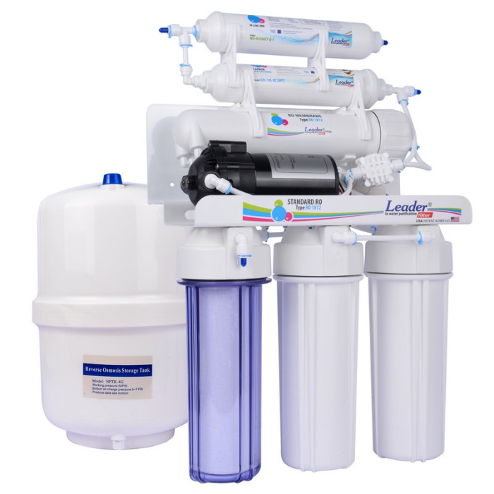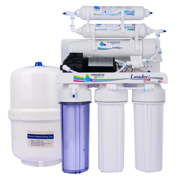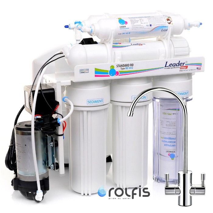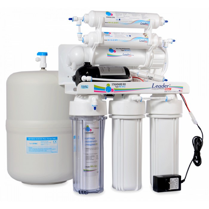 Данная система оснащена насосом, который повышает входящее давление воды. Такая система подойдет тем, у кого нет постоянного давления в водопроводе минимум 2,8 атм. Если давление воды выше - Вам подойдет стандартная система - Leader Standart RO-6 без насоса.