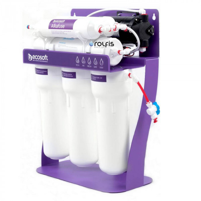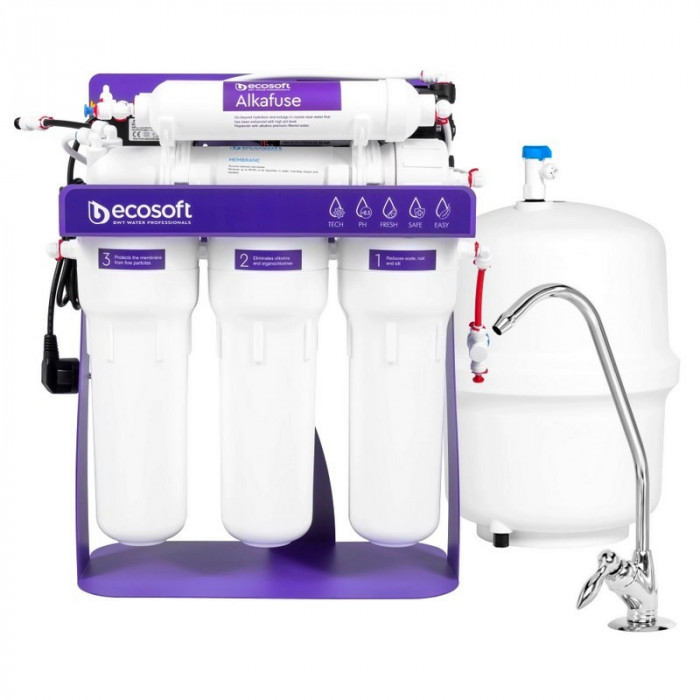 Обратный осмос Ecosoft P'URE Alkafuse MO675MALCPSECO с помпой - инновационная модель системы обратного осмоса с к минерализатором Alkafuse — повышает pH воды, обогащает ее минералами магния, картридж AquaGreen — защищает мембрану от чрезмерного загрязнения и технология AquaSpring — баланс минералов кальция и магния делает воду освежающе вкусной и полезной. Технология обратного осмоса гарантирует безопасность воды. Фильтр очищает воду от 99,8% загрязнений, таких как фтор, хлор, свинец, органические соединения, такие как хлорамины, перфтороктановая кислота (PFOA) и перфтороктансульфоновая кислота (PFOS), а также бактерии и вирусы.