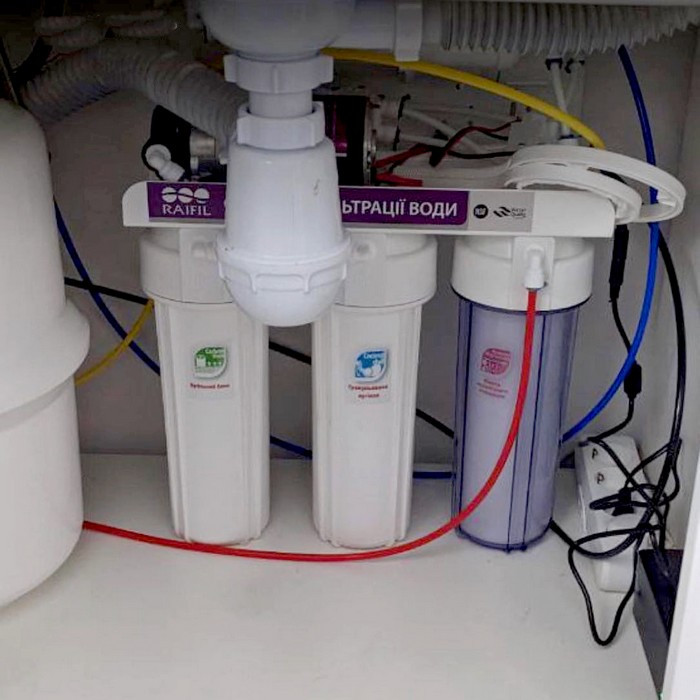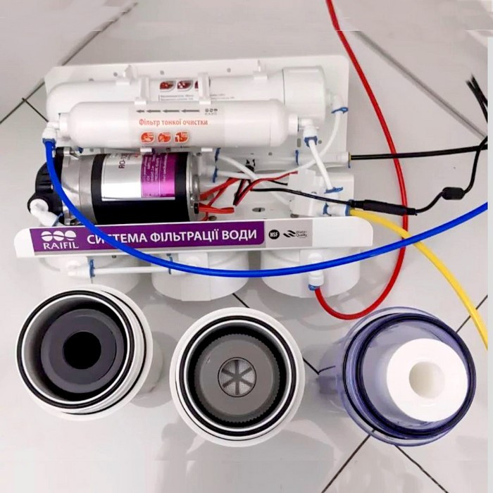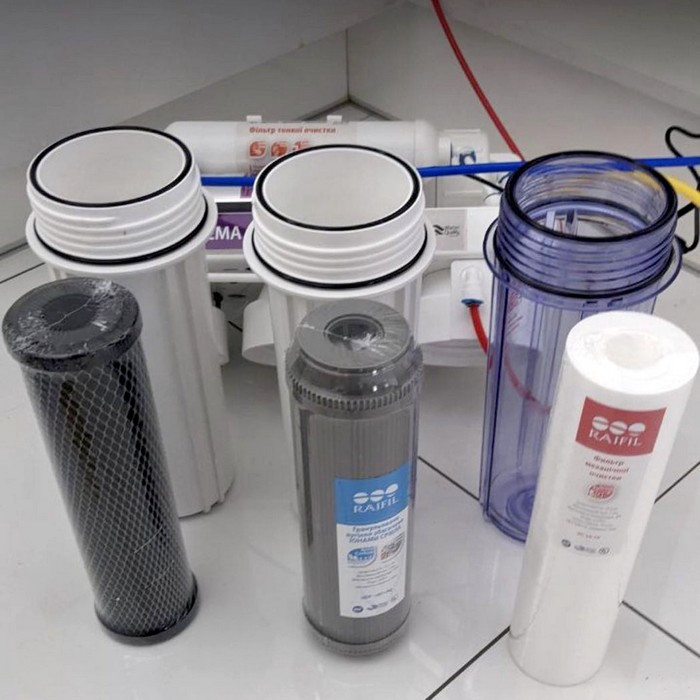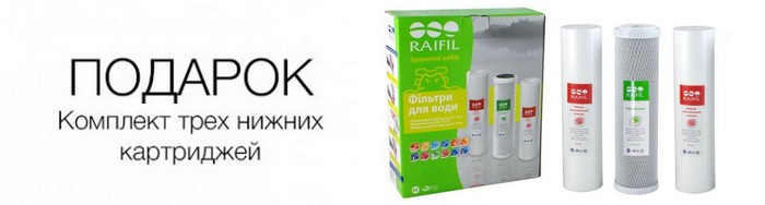 В комплект входят все необходимые элементы для подключения. Замена трех нижних картридж производится в среднем раз в пол года (Комплект картриджей Raifil 1-2-3), постфильтр и минерализатор меняется раз в год, мембрана меняется раз в 2-3 года.