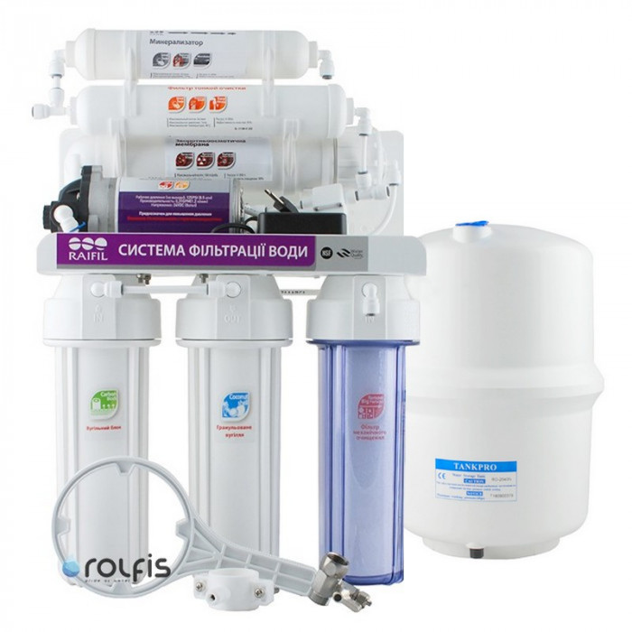 Фильтр обратного осмоса Raifil Grando 6+ - качественная система для очистки воды до питьевого уровня с минерализатором и помпой. Колбы в системе изготовлены из качественного прочного пластика и крепятся они на металлический кронштейн. Колбы имеют два уплотнительных кольца, что повышает их прочность и надежность. Первая колба стоит прозрачная и это дает возможность следить за состоянием картриджа и своевременно его заменить.