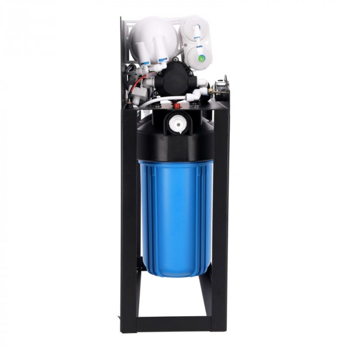 Благодаря стальному каркасу (раме), система более удобна в эксплуатации и менее подвержена механическим повреждениям. Осмотическая мембрана из материала Dow Filmtec - одна из самых эффективных мембран на мировом рынке. Система снабжена двойной предварительной фильтрацие - две колбы типоразмера Big Blue 10. В комплектацию системы входит кран для чистой воды в стиле Modern, а также насос, который позволяет использовать данную систему обратного осмоса даже при низких показателях входящего давления воды.