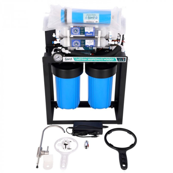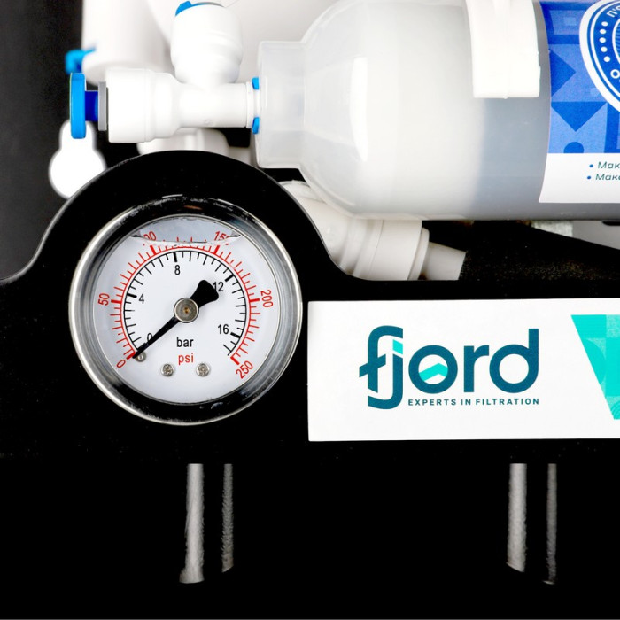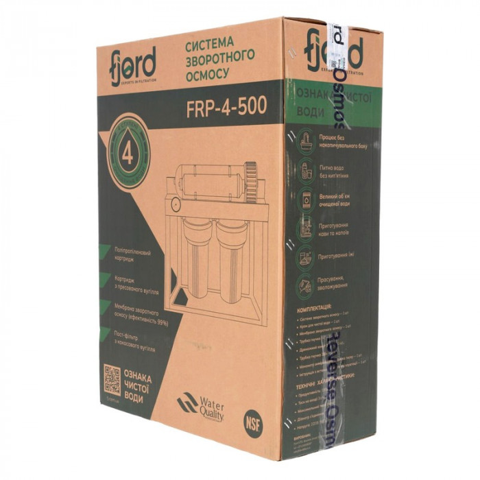 Система обратного осмоса Fjord FRP-4-500 (1900 л/сутки) - система фильтрации воды с мембраной на 500 галлон и насосом для повышения давления (в случаях, когда значение давления менее 2,8 атм). Осмос Fjord 500 GPD комплектуется эффективной осмотической мембраной Fjord RO-500 GPD, что позволяет использовать его без накопительного бака, так называемым прямоточным образом. Обратный осмос Fjord предназначена для улучшения качества воды методом обратного осмоса. Удаляет из воды 95-98% всех примесей: механических, растворенных соединений и микроорганизмов. Система предназначена для установки в тумбу под мойку, дополнительный смеситель необходимо установить в раковину или в кухонную столешницу.