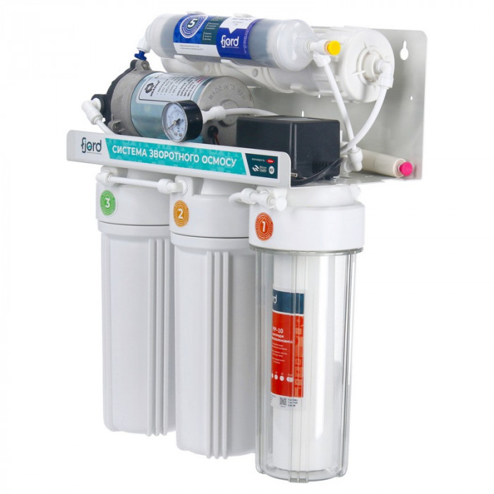 Система обратного осмоса Fjord FRP 5-75 (280 л/сутки) - система фильтрации воды обратным осмосом с насосом для повышения давления входящей воды (в случаях, когда значение давления менее 2,8 атм). Осмос Fjord комплектуется эффективной осмотической мембраной Fjord RO-75 GPD и вместительным накопительным баком 3,2 галлона (15л). Система предназначена для улучшения качества воды методом обратного осмоса. Удаляет из воды 95-98% всех примесей: механических, растворенных соединений и микроорганизмов. Система предназначена для установки в тумбу под мойку, дополнительный смеситель необходимо установить в раковину или в кухонную столешницу.
