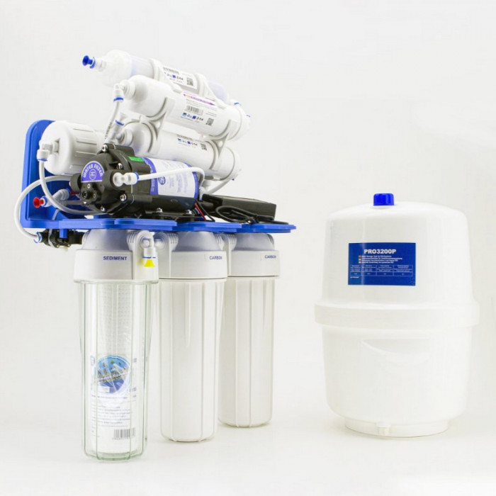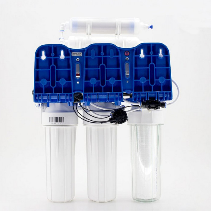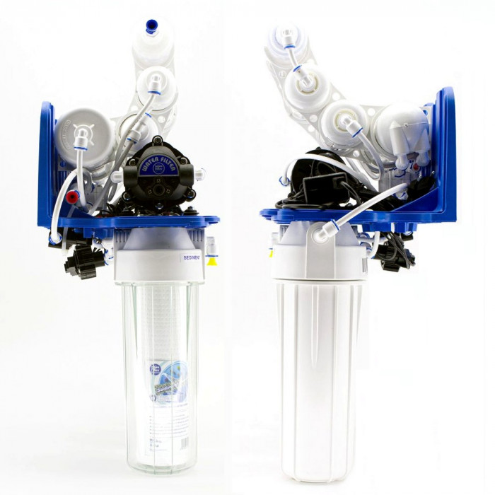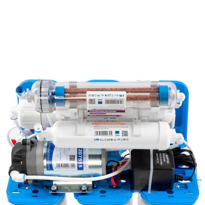 Фильтр оснащен минерализатором, который обогатит вашу воду: Ca – 34mgl, Mg – 12mgl, Na – 22mgl, K – 8,5mgl, анионами: CO – 10mgl, SO – 0,3mgl, Cl – 0,8mgl, F – 0 . То есть вода из просто питьевой превращается в минеральную воду. Если давление в водопроводе меньше 3 атм необходимо установить повышающий насос, а если давление превышает 6 атм – установит регулятор давления (редуктор).