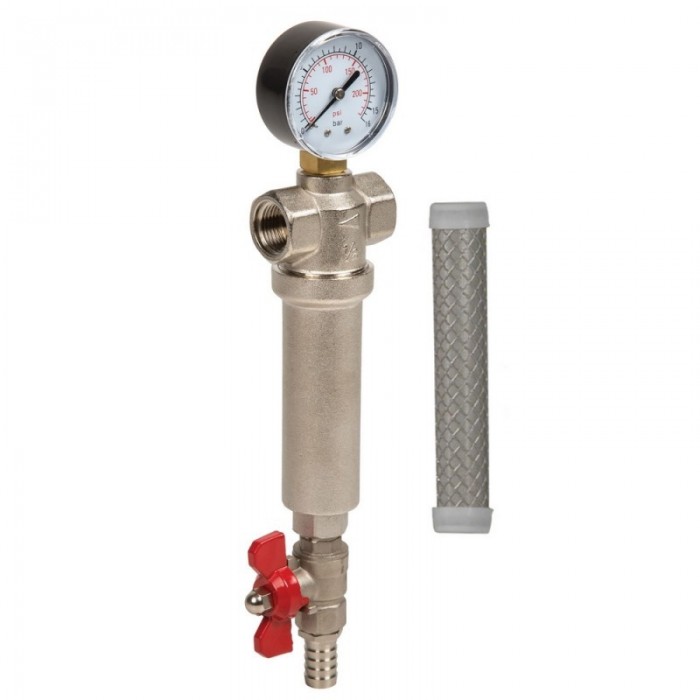 Фильтр осадочный/грязевик Aquafilter FHMB34-X - латунный механический фильтр для очистки холодной и гарячй воды с резьбой 1/2", с сеточным картриджем из нержавеющей стали (100 мкм), датчиком давления и спускным клапаном. Фильтр грубой очистики Aquafilter FHMB34-X - компактный магистраьлный фильтр для удаления из воды взвешенных частиц, размер которых превыщает 100 мкм