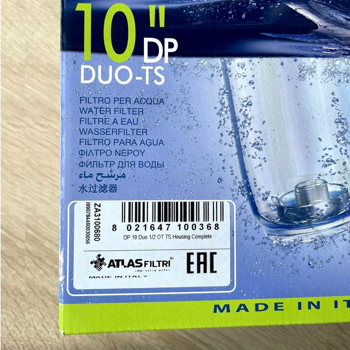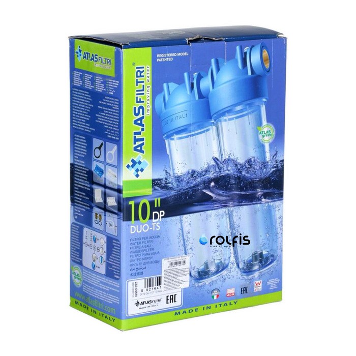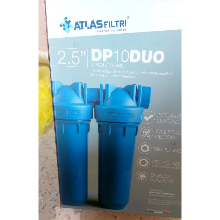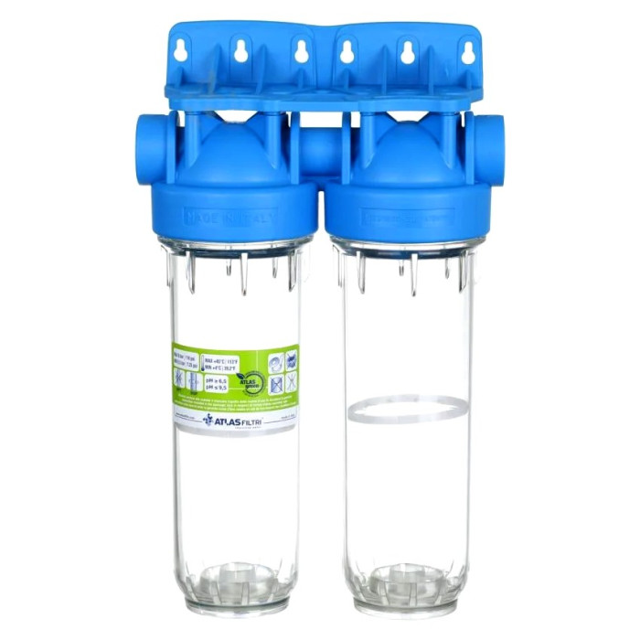 ATLAS Filtri DP DUO TS 1/2" OT 10" (ZA3100680) - магистральный фильтр итальянского производства для очистки холодной воды, состоящий из двух прозрачных колб смонтированных на одном пластмассовом кронштейне.