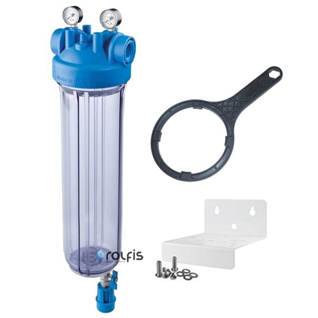 Atlas Filtri DP BIG S M TS 1 20" kit ZA1800735 - прозрачный магистральный фильтр с двумя манометрами и краном для слива со штуцером. Предназначен для очистки холодной воды хозяйственно-бытового назначения. Типоразмер фильтра - Big Blue 20. Фильтр изготовлен из прозрачного прочного пластика. Atlas DP Big 20 TS S M TS имеет высокую пропускную способность за счет использования сменных картриджей с внешним диаметром 4.5".