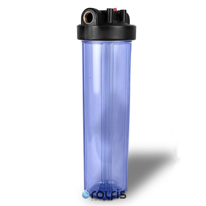 Подключение - 1" (резьба латунная). На крышке есть кнопка сброса давления. Корпус имеет стандартный размер Big Blue 20, поэтому можно использовать с данным корпусом любые картриджи размера ВВ20 - 20х4,5" (механические, угольные, умягчающие, обезжелезивающие и т.д.).