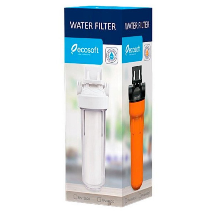 Ecosoft FPV12ECO (FPV12ECO) - 10" натрубный фильтр для очистки холодной водопроводной воды от механических примесей находящихся в ней. Фильтр состоит из двух частей - крышка с латунной резьбой для присоединения размером 1/2" и прозрачного стакана.