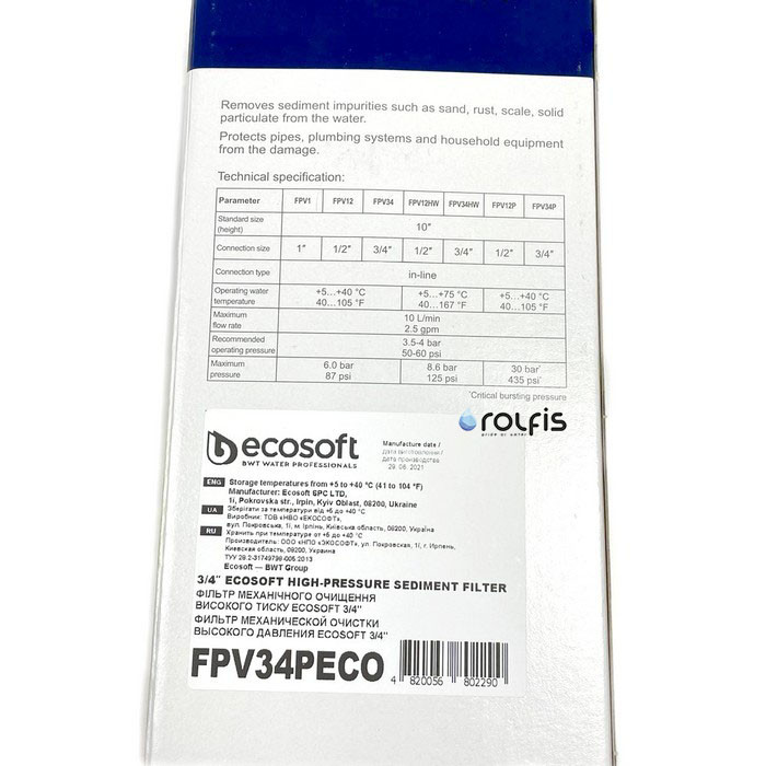 Фильтр механической очистки высокого давления Ecosoft 3/4" (FPV34PECO) - 10" натрубный непрозрачный фильтр для очистки холодной водопроводной воды от механических примесей находящихся в ней. Фильтр состоит из двух частей - крышка с латунной резьбой для присоединения размером 3/4" и белого прочного стакана.