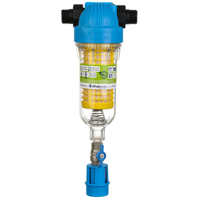 Одноступенчатый промывной фильтр Atlas Hydra DS с подключением 3/4-1" дюйм имеет функцию промывания в противотоке, что обеспечивает лучшее удаление частиц, которые накопились на поверхности патрона (активируется при открытии сливного клапана на дне фильтра).
