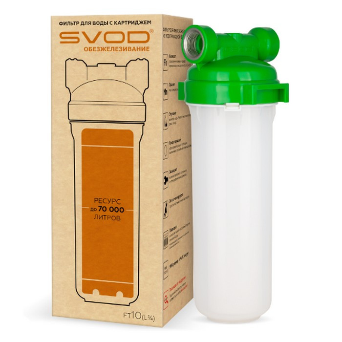 Фильтр от железа СВОД FT10 Ø3/4" предназначен для удаления железа из водопроводной или скваженной воды. Наполнителем в фильтре СВОД служит гидрофобный, структурированный материал с развитой поверхностью. Благодаря специальной обработке, на поверхности материала образуются комплексы функциональных групп, которые максимально извлекают из воды железо в любых формах (окислы железа, соли железа и др. соединения).