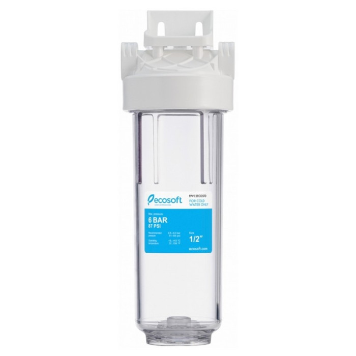 Ecosoft Standard 3/4" (FPV34ECOSTD) - 10" натрубный корпус для очистки холодной водопроводной воды от примесей находящихся в ней. Фильтр состоит из двух частей - крышка с латунной резьбой для присоединения размером 3/4" и прозрачного стакана.