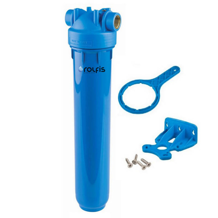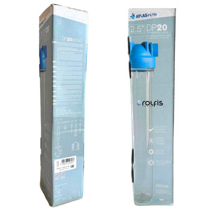Корпус фильтра Atlas Filtri DP MONO AB 1/2" OT 20" KIT ZA1381312 - фильтр-колба для фильтрации холодной воды - одностадийной очистки, размером 20 х 2,5" и резьбовым подключением 1/2". Устанавливается на трубопроводе с холодной водой и используется в бытовых целях.