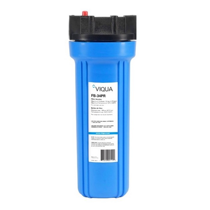 Viqua FB-34PR - корпус фильтра от канадского производителя Viqua, является очень качественным и прочным среди аналогичных магистральных фильтров типа Slim 10. Состоит из двух элементов: стакан (синего цвета с ребрами жесткости) и крышка с пластмассовой резьбой 3/4” и кнопочным клапаном для стравливания избыточного давления воздуха.