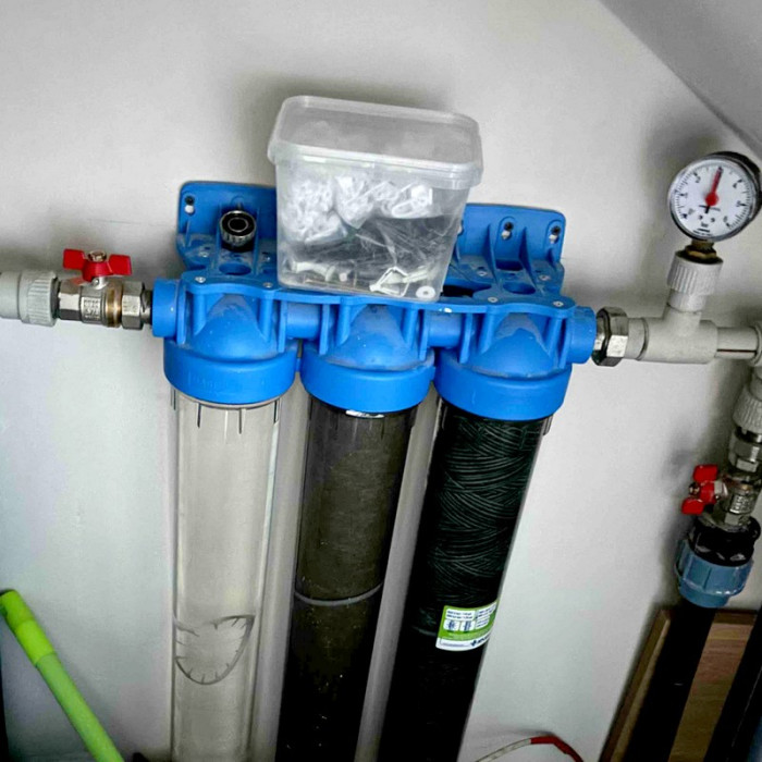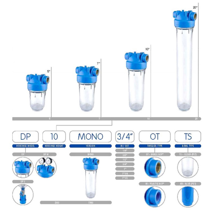 Комплектация: состоит из прозрачных корпусов размером Slim 20 (20" х 2,5") и синей крышки, пластикового кронштейна и ключа для колбы. Картриджи в комплект не входят.