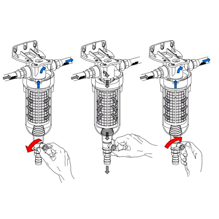 Одноступенчатый промывной фильтр Atlas Hydra M с подключением 11/4 дюйма имеет функцию промывания в противотоке, что обеспечивает лучшее удаление частиц, которые накопились на поверхности патрона. Для того, чтоб почистить закупорившийся фильтрующий элемент, необходимо просто открыть клапан, который расположен на дне стакана. Благодаря этому, внутри фильтра Atlas Hydra M-RLH-90 образуется пониженное давление, которое толкает патрон вниз и автоматически изменяет направление потока воды изнутри наружу (противоток) патрона. В следствии чего уносит с собой накопившиеся на патроне частицы и вещества и направляет их на слив.