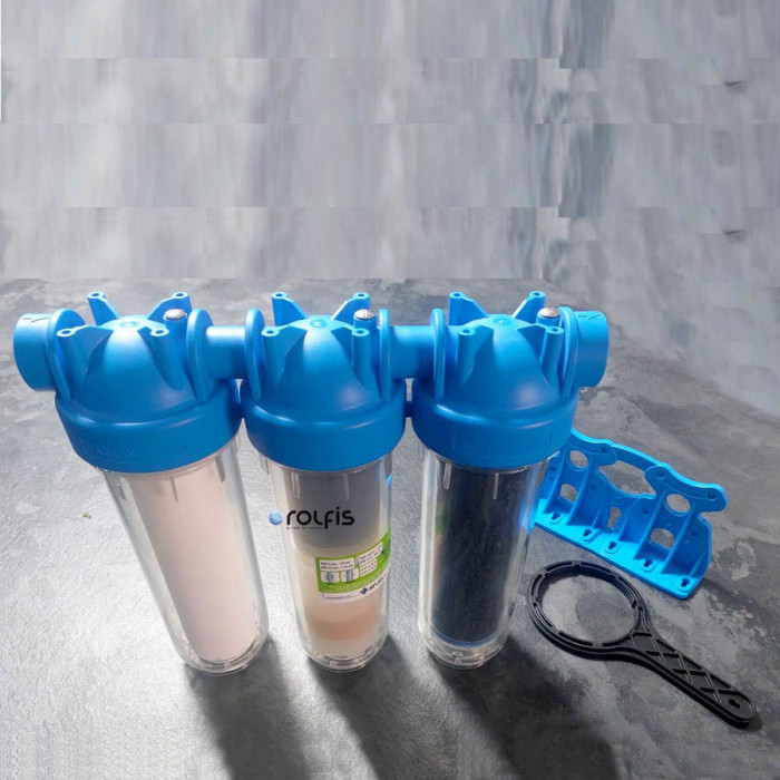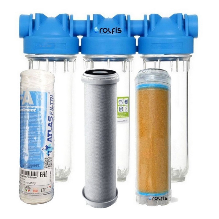Atlas Filtri 10 DP Trio 3/4" + картриджи 10" - компактная тройная система очистки холодной воды от нескольких показателей. Магистральный фильтр Atlas Filtri DP TRIO 3/4" OT 10" ZA3310680 - итальянского производства, состоит из трех колб смонтированных на одном пластмассовом кронштейне. Предназначен данный магистральный фильтр для очистки воды от таких примесей как: взвешенные разнообразные механические частицы, сорбционный картридж из спрессованного активированного угля с пористостью 10 мкм, антинакипной картридж, воздействующие на воду таким образом, что при её нагревании не образуются солевые отложения на рабочих поверхностях.
