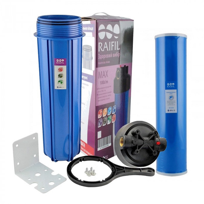 Корпус фильтра Raifil изготовлен из прочного пластика синего цвета. На крышке корпуса имеется кнопка сброса давления, что упрощает замену картриджей. Корпус Raifil имеет типоразмер ВВ20 и совместим со всеми картриджами размером Big Blue 20", что дает возможность в дальнейшем использовать не только угольный картридж, но и механический, умягчяющий, обезжелезивающий и т.д.