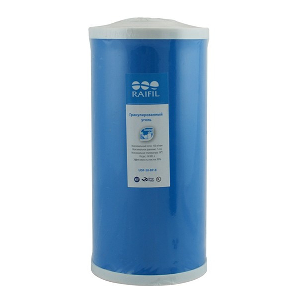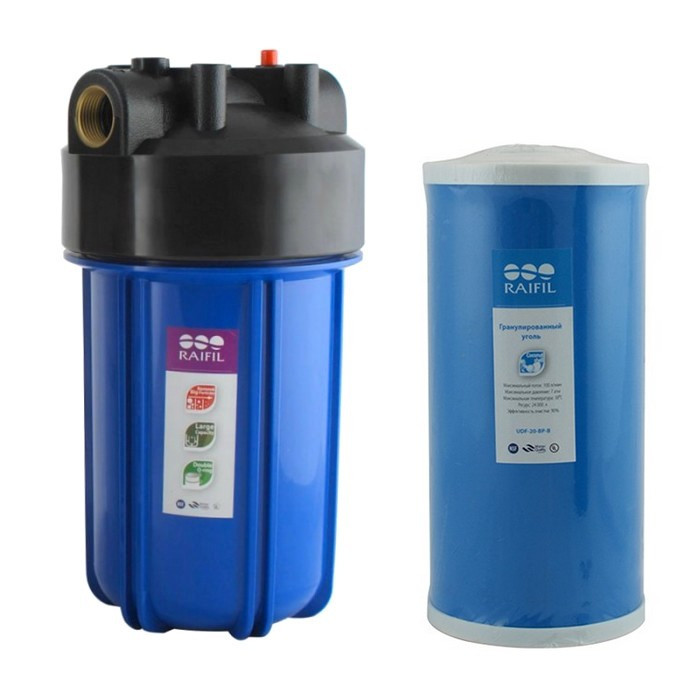 Корпус фильтра Raifil BB10 + угольный картридж - Магистральный фильтр Raifil для очистки холодной воды в квартирах и домах со средним водопотреблением. Может использоваться как для водопроводной, так и для воды из скважин. Фильтр поставляется вместе с картриджем из гранулированного активированного угля, который эффективно очищает воду от хлора и различных органических загрязнений.