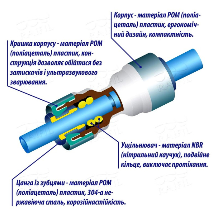 Материал фитинга – POM (полиацеталь) пластик.