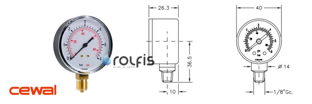 Манометр вертикальный CEWAL М40 RP 1/8" 10 bar 91441411 +++++