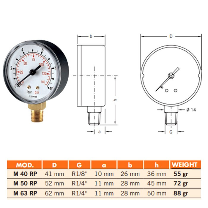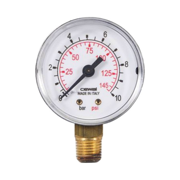 Манометр вертикальный CEWAL М50 RP 1/4" 4 bar 91453211 - манометр с радиальным присоединением для измерения давления в диапазоне 0-4 бар. Используется для измерения и индикации давления в системе водоснабжения. Манометр CEWAL изготовлен из противоударного корпуса из пластика, небьющееся стекло из метакриллата. Подсоединение — латунь. Чувствительный элемент — трубка Бурдона из медного сплава. Манометр имеет двойную шкалу Bar/PSI. Класс точности 2,5.