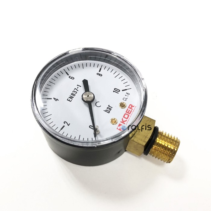 KOER bar - Радиальный манометр (50 мм) используется для измерения и индикации давления в системе водоснабжения. Также данный чешский манометр применяется в редукторах давления воды для отображения значения после редуктора. Манометр Koer 4 бара обладает классом точности CL 1,6, пластиковым корпусом с акриловым стеклом, диаметр присоединительной резьбы 1/4".