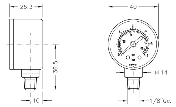 CEWAL М 40 RP - манометр с радиальным присоединением для измерения давления с различным диапазоном подключения. Используется для измерения и индикации давления в системе водоснабжения. Манометр CEWAL изготовлен из противоударного корпуса из пластика, небьющееся стекло из метакриллата. Подсоединение — латунь. Чувствительный элемент — трубка Бурдона из медного сплава. Манометр имеет двойную шкалу Bar/PSI. Класс точности 2,5.