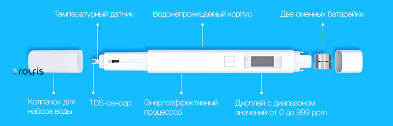Тестер Xiaomi Mi TDS Pen отображает значения в диапазоне от 0 до 999 ppm (миллионных долей, 1ppm = 1 мг/л), а специальный датчик корректирует выводимые на монохромный дисплей значение ppm исходя из температуры измеряемой жидкости.