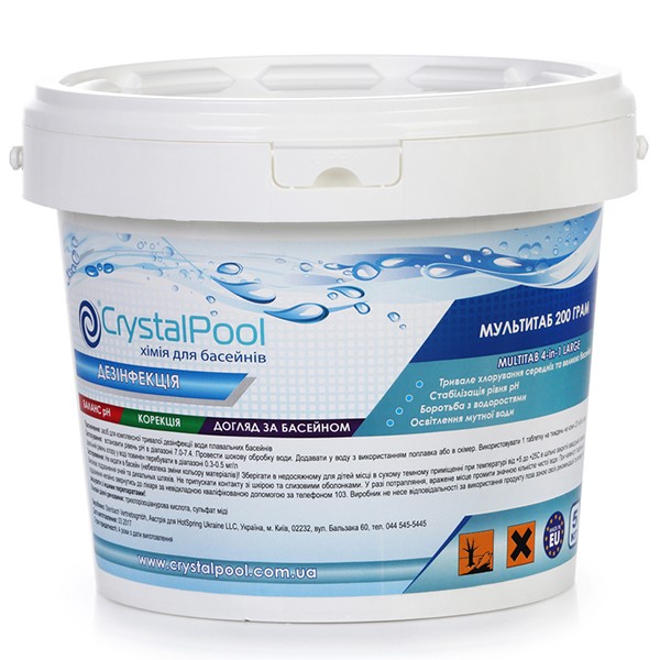 Crystal Pool MultiTab 4-in-1 Large - многофункциональные медленнорастворимые хлорные таблетки (по 200 г) для комплексной очистки бассейна. Применяются для средних и для больших бассейнов, но если таблетки ломать на несколько частей можно использовать и в маленький бассейнах.