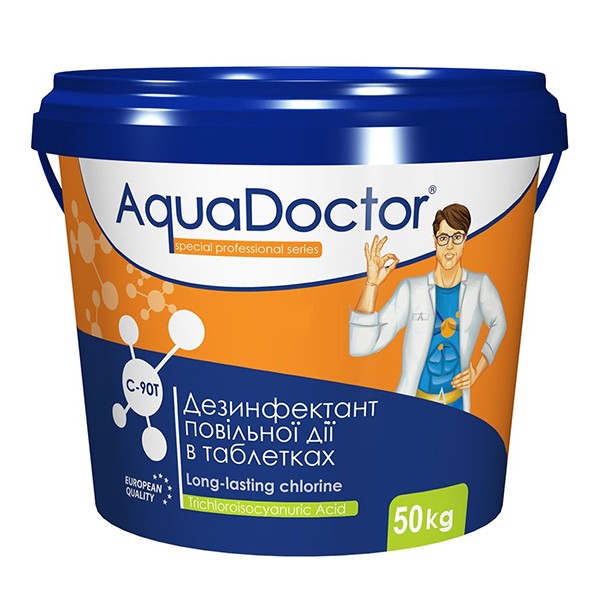 AquaDoctor C90-T - медленно растворимый препарат в виде таблеток по 200 грамм для длительной регулярной дезинфекции воды в бассейне. Препарат на основе Trichloroisocyanuric Acid с содержанием активного хлора 90%.