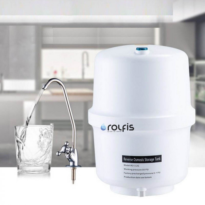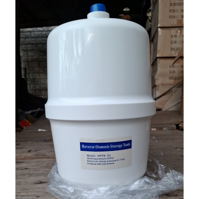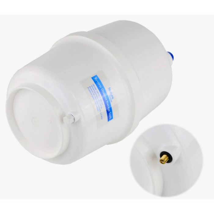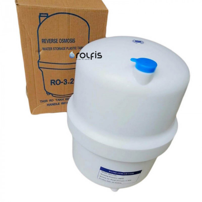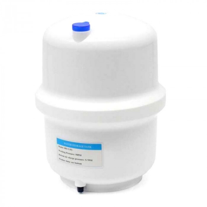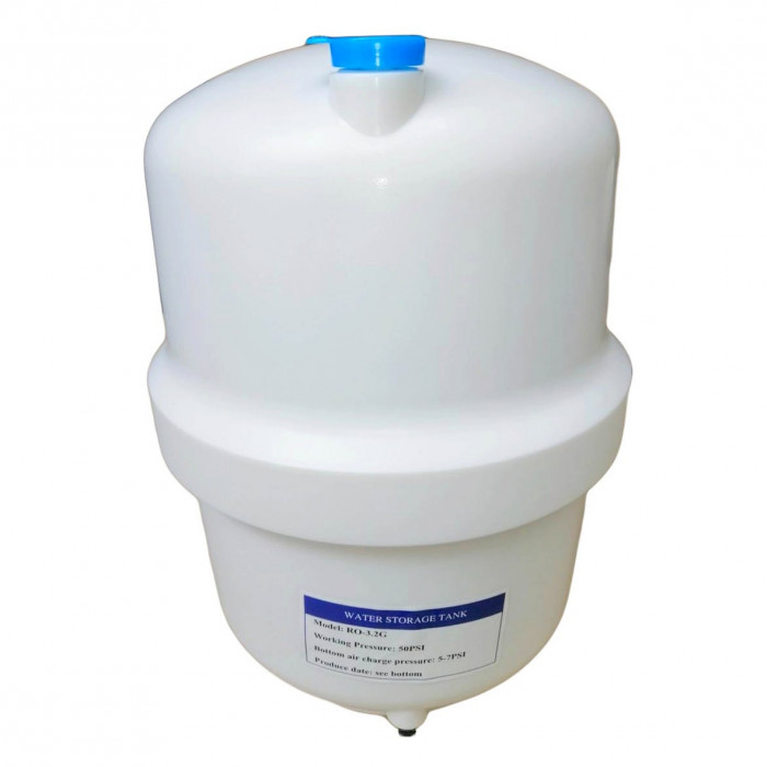В нижнюю камеру бака для воды RO-3,2G (подобна резиновой груше) - пространство между стенкой емкости и диафрагмы закачан воздух. Избыточное давление, которое должно быть создано в пустом баке — около 0,7 атм. Подача чистой воды после обратноосматической мембраны осуществляется в середину резиновой груши. Этот процесс продолжается до тех пор, пока давление сжимающегося воздуха между баком и диафрагмой не уравновесит давление воды на входе в бак. Благодаря давлению воздуха мембрана раздувается, что дает возможность полностью опорожнять от воды бак.