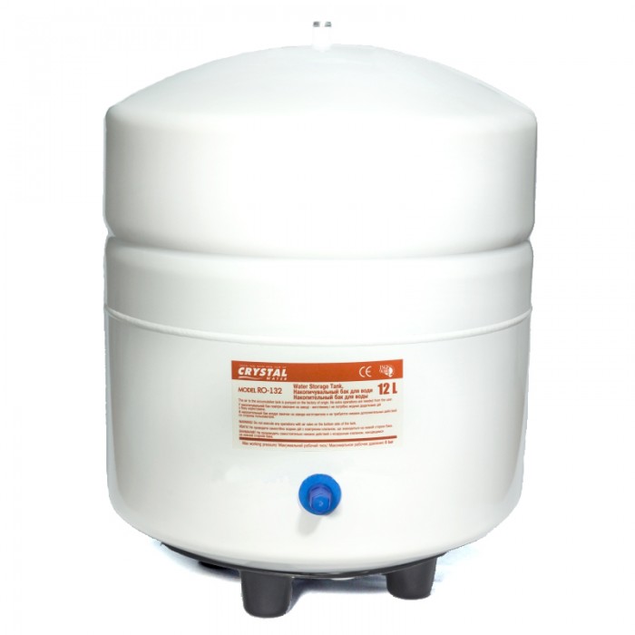 Металлический накопительный бак Crystal RO 132 имеет общий объемом 12 л используется в системе обратного осмоса Crystal для хранения подачи очищенной воды на отдельный кран установленный на мойке. Изготовлен накопительный бак Crystal RO 132 из металла окрашенного в белый цвет. Внутри корпуса накопительной емкости находится мембрана из пищевой резины, которая заполнена воздухом (давление от 0,6 до 0,8 атм) для выдавливания воды находящегося в емкости бака при открытии крана на мойке.
