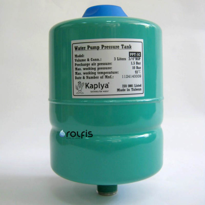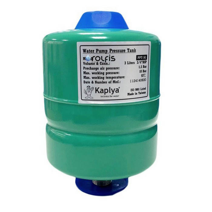 Накопительный бак Kaplya PPT-5G – Гидроаккумулирующий мембранный бак с диафрагмой общим объемом 3 литра. Применяется в системах водоснабжения с насосом погружного или поверхностного типа в качестве гидрокомпенсатора, который компенсирует гидроудар в системе и является резервуаром воды под давлением.