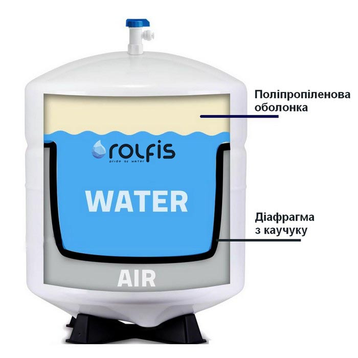 Бак Kaplya SPT-140S для фильтра обратного осмоса внутри разделен на два отсека: нижняя воздушная камера, которая отделяется от верхней специальной упругой резиновой мембраной. Такая конструкция позволяет "выдавливать" чистую воду при открытии крана давлением закаченного воздуха, без другого внешнего воздействия. Поэтому такой параметр как объем бака представляется двумя показателями: общий объем емкости - 40 литров и полезный (рабочий) - 30-32 литра для накопления чистой воды.